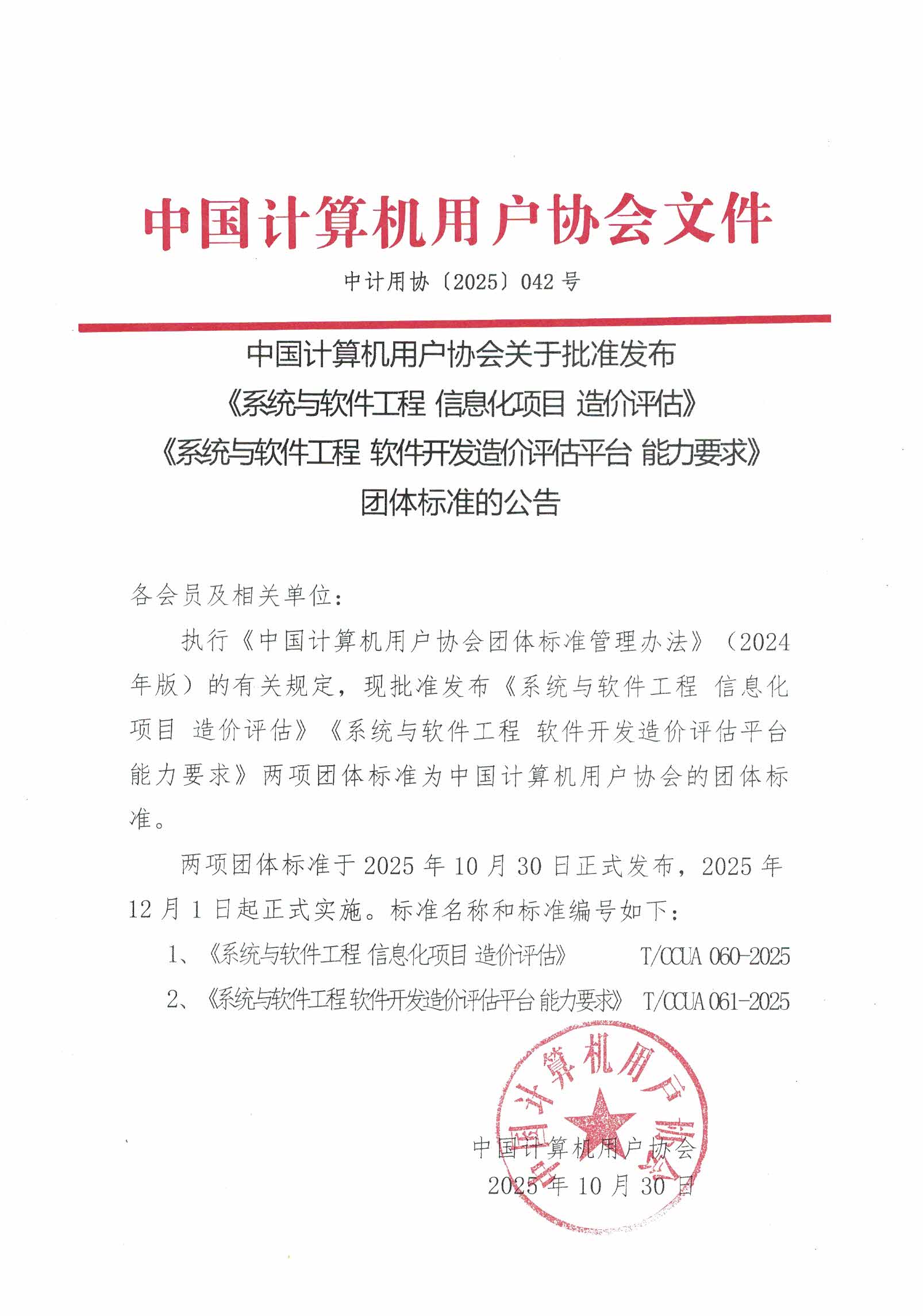 关于批准发布《系统与软件工程 信息化项目 造价评估》等两项团标的公告