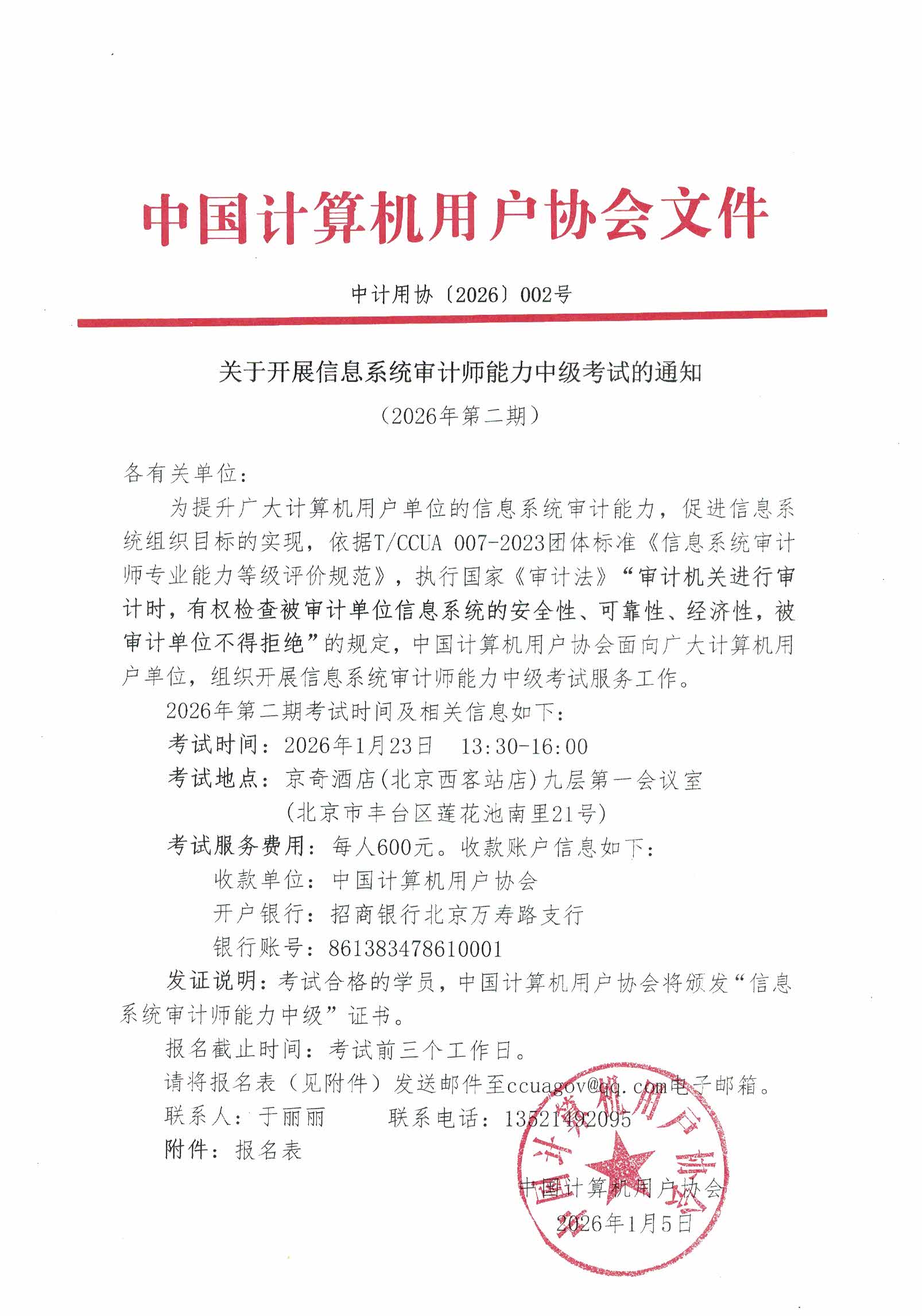 关于开展信息系统审计师能力中级考试的通知(2026年第二期)