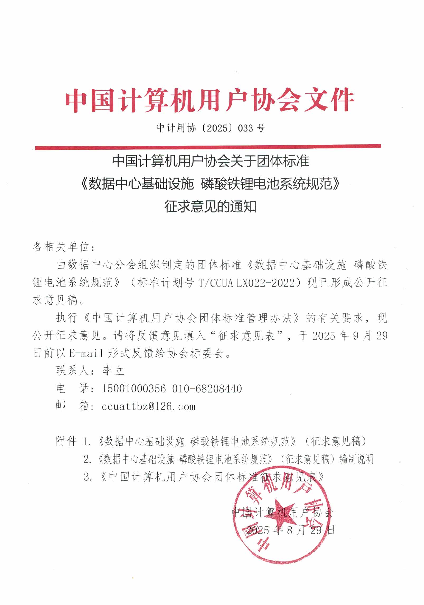 关于团体标准《数据中心基础设施 磷酸铁锂电池系统规范》征求意见的通知