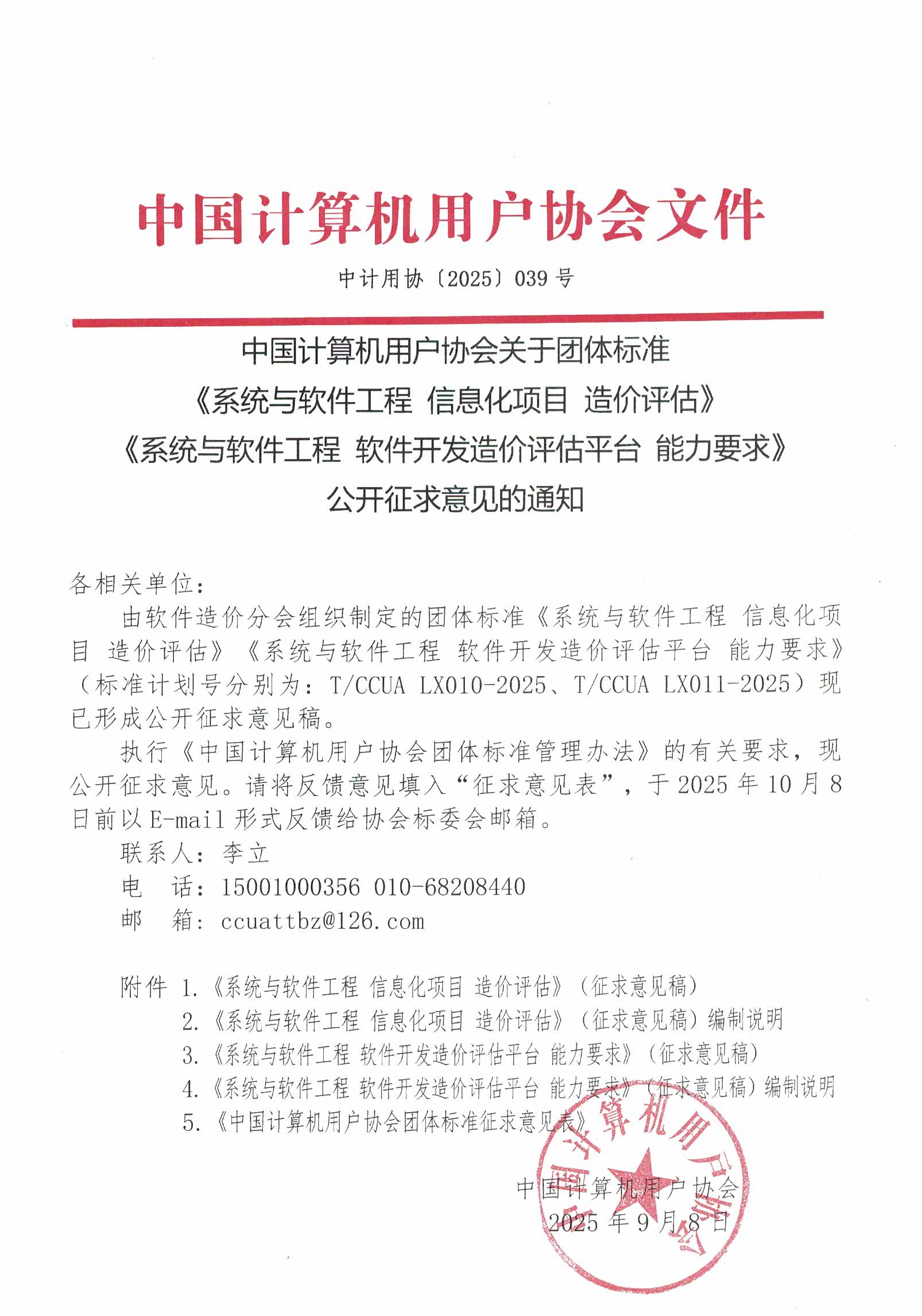 关于《系统与软件工程 信息化项目 造价评估》《系统与软件工程 软件开发造价评估平台 能力要求》两项团体标准征求意见的通知